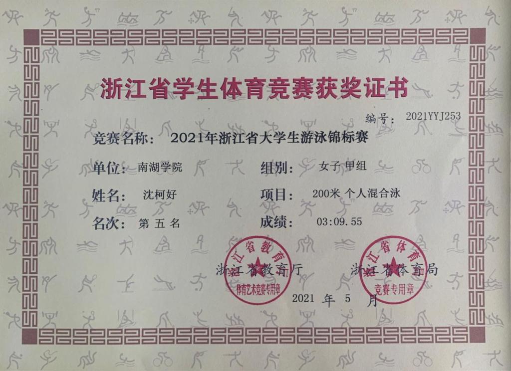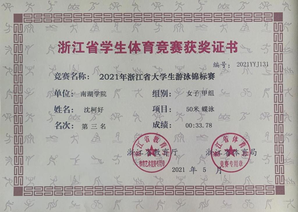 5月27日至5月30日,2021年浙江省大学生游泳锦标赛在苍南县体育中心游泳馆举行,本次比赛由浙江省教育厅、浙江省体育局主办,全省共55所高校参赛、甲乙丙丁4个组别,共计运动员561人。在学校及部门领导的关心与支持下,全体队员们经过三天紧张激烈的竞争和顽强拼搏,best365体育官方网站游泳队沈柯好同学获得女子甲组50米蝶泳第三名和200米个人混合泳第五名;方婉丽同学获得女子甲组200米仰泳第六名和100米仰泳第八名的成绩。本次比赛展示了best365体育官方网站莘莘学子勇往直前的体育精神,展现了体育人锐意进取的精神风貌,希望在学校和部门领导的支持下,按照实际情况去制定更加适合队员的训练计划,从思想、技术和身体素质等多个环节上挑选人才,严格训练,今后大家将继续一起努力,奋发向上,为校争得更多荣誉!